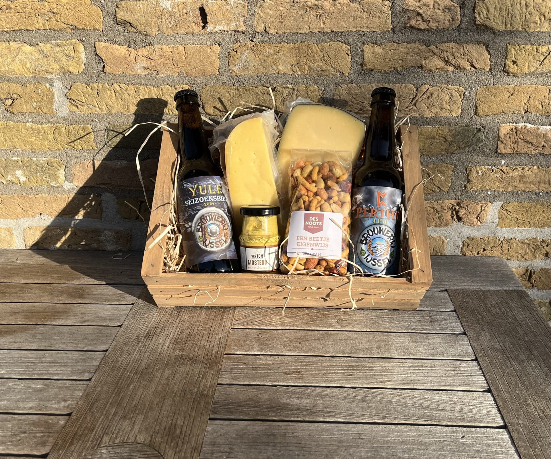 Een mand of doos met lokaal lekkers, deels streekproducten uit de Krimpenerwaard, of van daarbuiten.